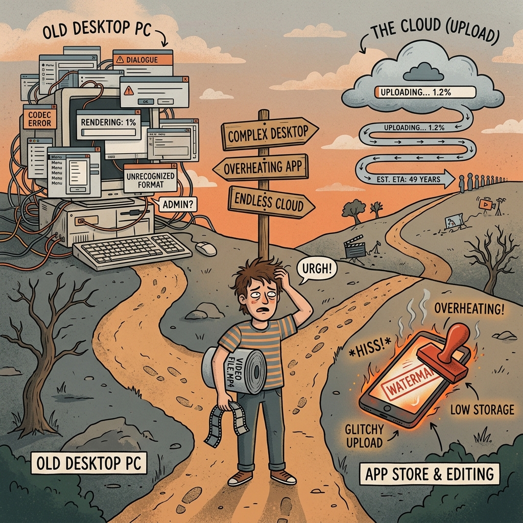 Модель «загрузи → обработай → скачай» проектировалась для эпохи 720p-файлов по 50 МБ. Сегодня минута 4K-записи на смартфон — это 300–400 МБ. 10-минутный ролик — 3–4 ГБ. Модель не масштабируется.