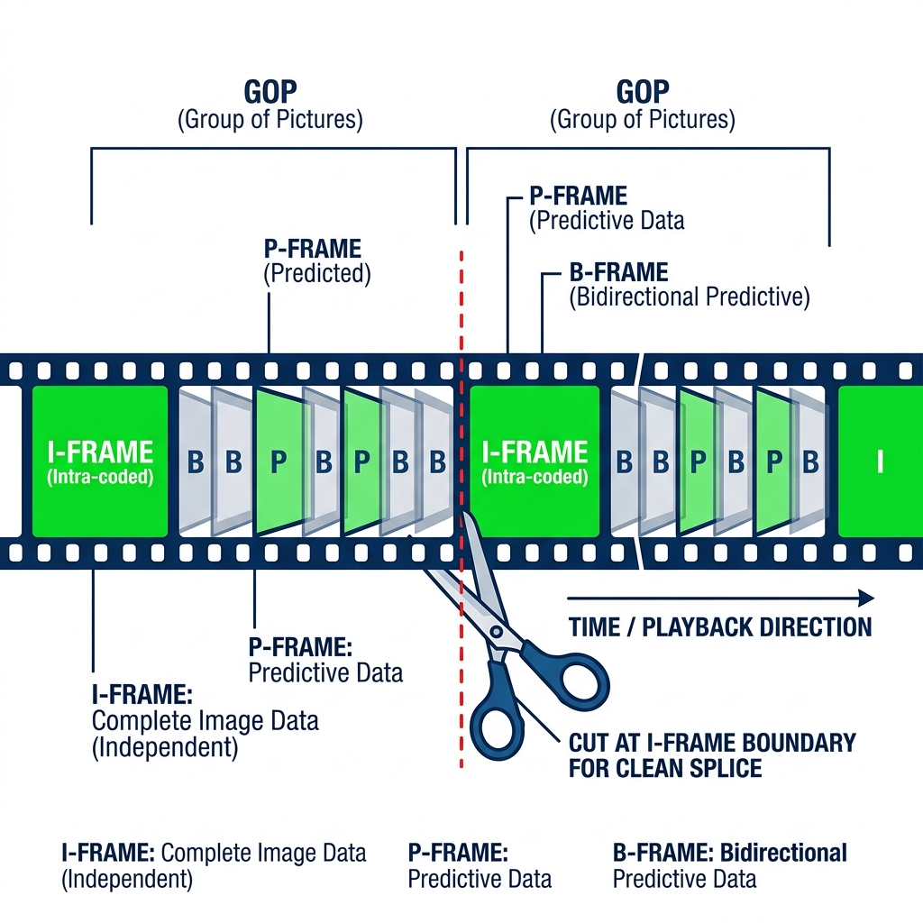 Файл разрезается по границам ближайших I-frames на уровне контейнера (MP4, MKV). Видеопоток копируется побитово — ни один пиксель не пересчитывается. Технически это называется remux.